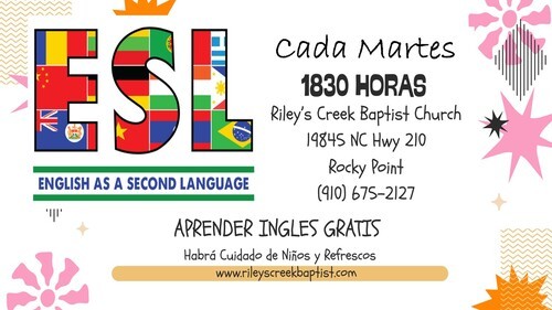 ESL class meets every Tuesday at 6:30 PM at Riley's Creek Baptist. Childcare and snacks. The calss is free to all who come!